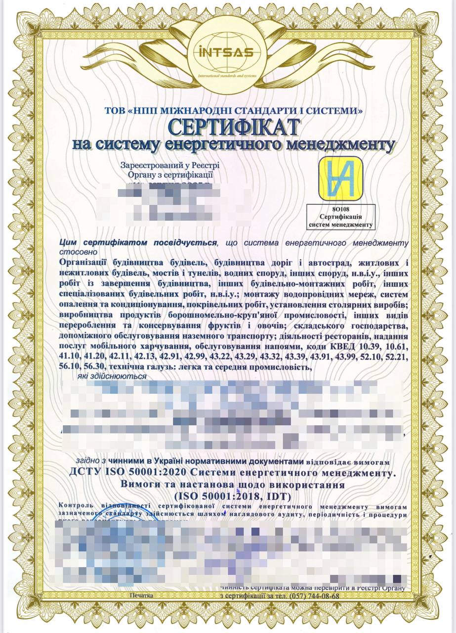 ДСТУ EN ISO 9001:2018 Системи управління якістю; ДСТУ ISO 9001:2015 Системи управління якістю; ДСТУ ISO 14001:2015 Системи екологічного управління. Вимоги та настанови щодо застосовування (ISO 14001:2015, IDT); ДСТУ ISO 45001:2019 Системи управління охороною здоров’я та безпекою праці. Вимоги та настанови щодо застосування (ISO 45001:2018, IDT); ДСТУ ISO 22000:2019 Системи керування безпечністю харчових продуктів. Вимоги до будь-якої організації в харчовому ланцюзі (ІSO 22000:2018, ІDT); ДСТУ EN ISO 13485:2018 Медичні вироби. Система управління якістю. Вимоги до регулювання (EN ISO 13485:2016, ІDT; ISO 13485:2016, ІDT); ДСТУ ISO 50001:2020 Системи енергетичного менеджменту. Вимоги та настанова щодо використання (ISO 50001:2018, IDT).