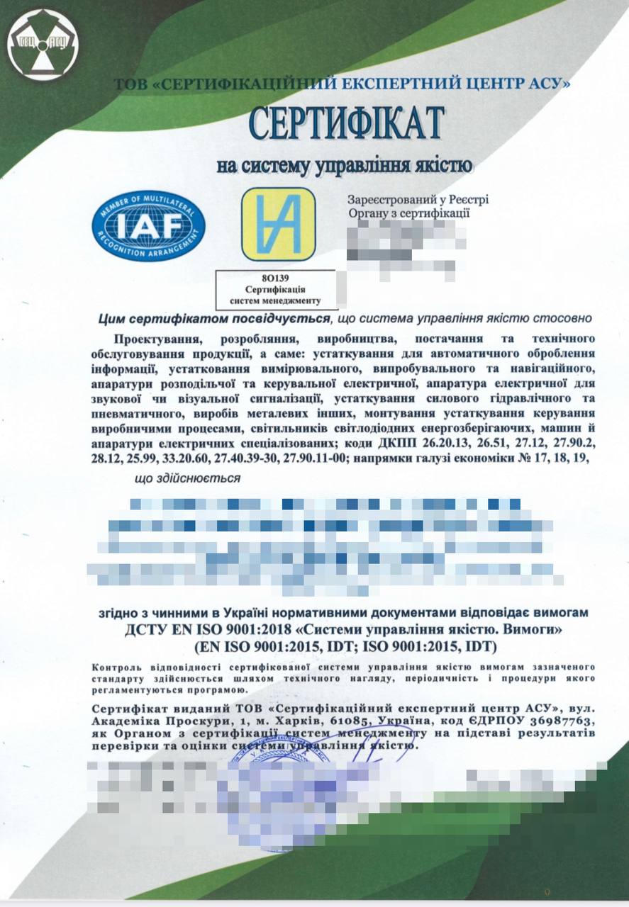 ДСТУ ISO 9001:2015 Системи управління якістю. Вимоги (ISO 9001:2015, IDT); ДСТУ EN ISO 9001:2018 Системи управління якістю. Вимоги (EN ISO 9001:2015, IDT; ISO 9001:2015, IDT);