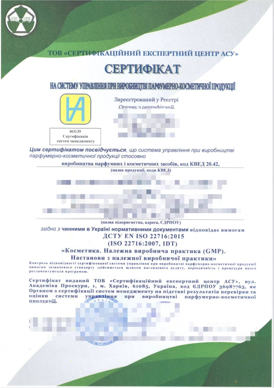 Сертифікація GMP (Good Manufacturing Practice) для косметичної продукції за стандартом IEN SO 22716 базується на міжнародних вимогах до якості та безпеки косметичних засобів. Цей стандарт є загальновизнаним у Європі та світі й забезпечує дотримання належної виробничої практики на всіх етапах виробництва та обігу косметики. В Україні діє Технічний регламент на косметичну продукцію, затверджений ПКМУ від 20.01.2021 № 65. Цей Технічний регламент встановлює вимоги до косметичної продукції, що вводиться в обіг на ринку, з метою забезпечення високого рівня захисту здоров’я людини. Згідно зі статтею 21 цього регламенту виробництво косметичної продукції повинне відповідати належній виробничій практиці з метою забезпечення дотримання цілей пункту 1 Технічного регламенту на косметичну продукцію. Основні нормативні документи, що регулюють впровадження ISO 22716: