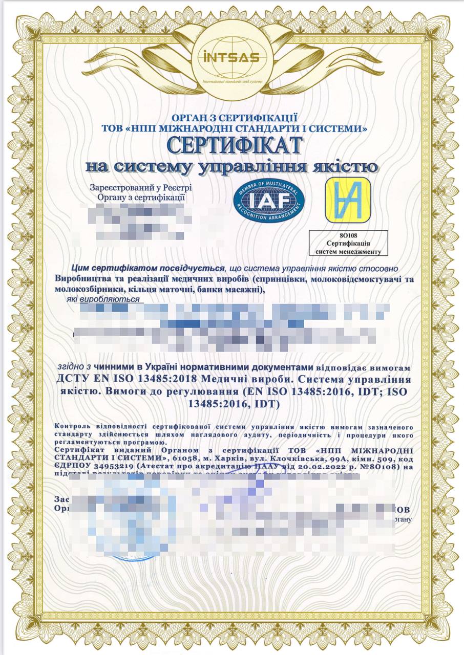 Сертифікат на систему управління якістю медичних виробів терміном дії 3 роки