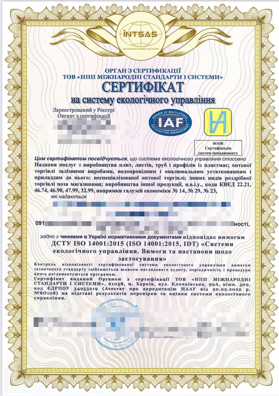 Наявність сертифіката ISO 14001 свідчить про відданість компанії принципам сталого розвитку, підвищує довіру клієнтів, інвесторів і регуляторів, а також може забезпечити конкурентні переваги як на локальному, так і на міжнародному ринку.