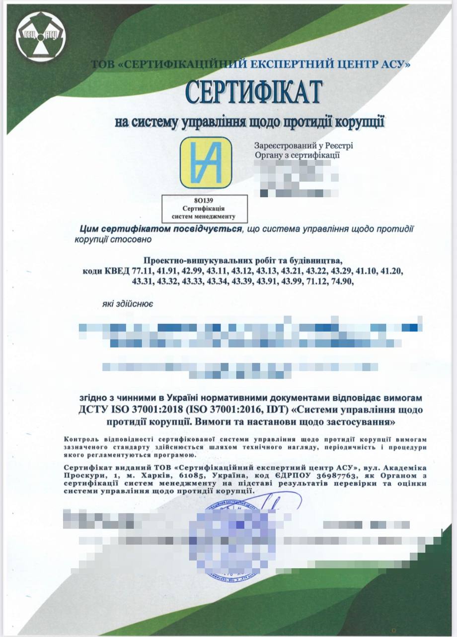 Сертифікат на систему управління щодо протидії корупції терміном дії 3 роки